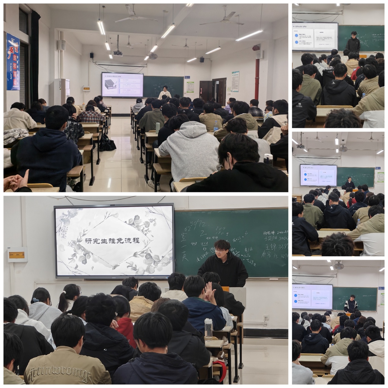 杨智林、于奕阳、王锦和秦家烁分别考取厦门大学、合肥工业大学、中国石油大学(华东)和电子科技大学的研究生。四位同学围绕考研择校、复习方法、心态调整等方面进行分享。杨智林提醒同学们,不要盲目跟风报考热门院校,要善用官网数据查询报录比、历年分数线。“选对了赛道,努力才会加倍奏效。”于奕阳建议将参考书目读“薄”再读“厚”,通过制作思维导图把零散的知识点串联起来。王锦表示,考研比拼的从来不是一时的速度,而是长久的恒心与定力。秦家烁强调,“上岸不是比谁学的时间长,而是比谁效率高、心态稳。”王武推免至南京师范大学,他结合自身经历,详细介绍了研究生推免的具体流程和注意事项。